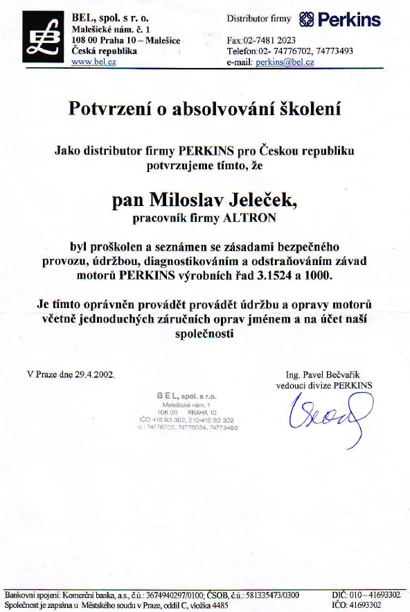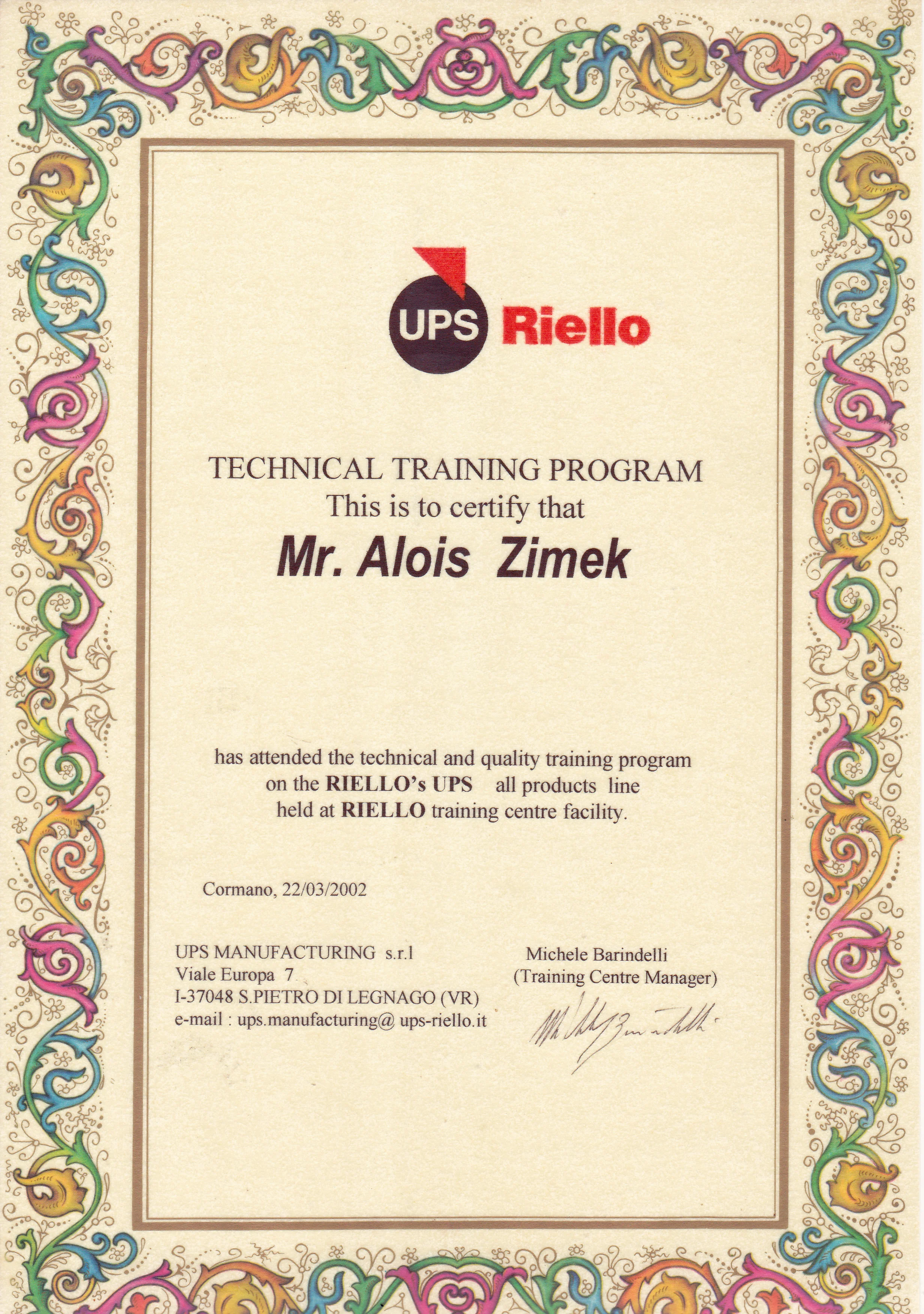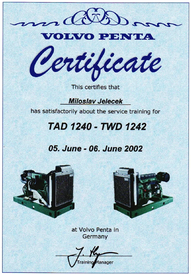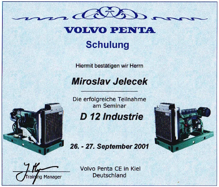 Jsme držiteli několika certifikátů od renomovaných výrobců motorů (Volvo Penta, Caterpillar, Perkins, John Deere, Deutz, IVECO - PFT a další), výrobců UPS (Riello, SCHRACK, Socomec, GE, Newave, ABB, APC, VERTIV Liebert a další). Jsme držiteli osvědčení OZO pro protipožární bezpečnostní zařízení (PBZ).