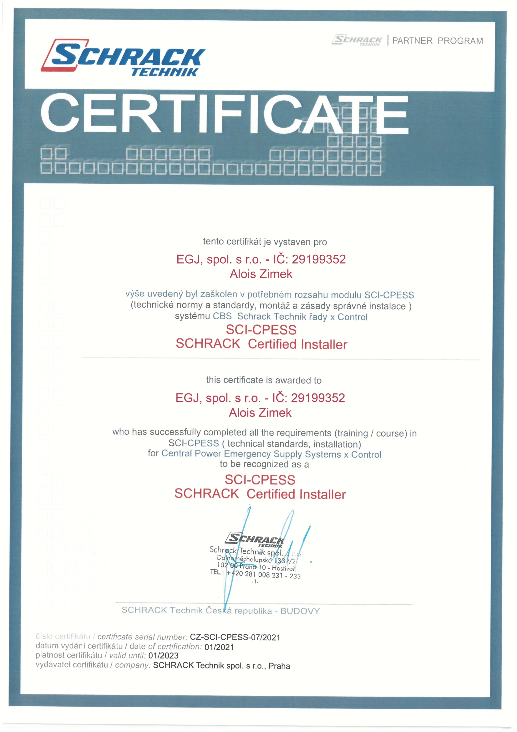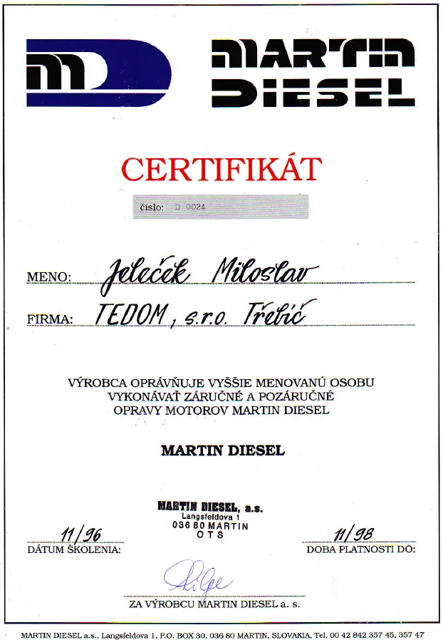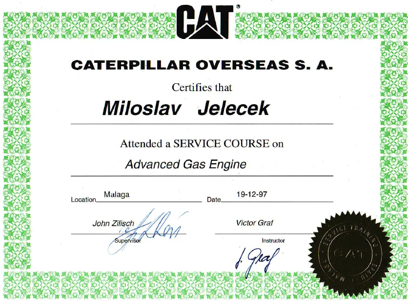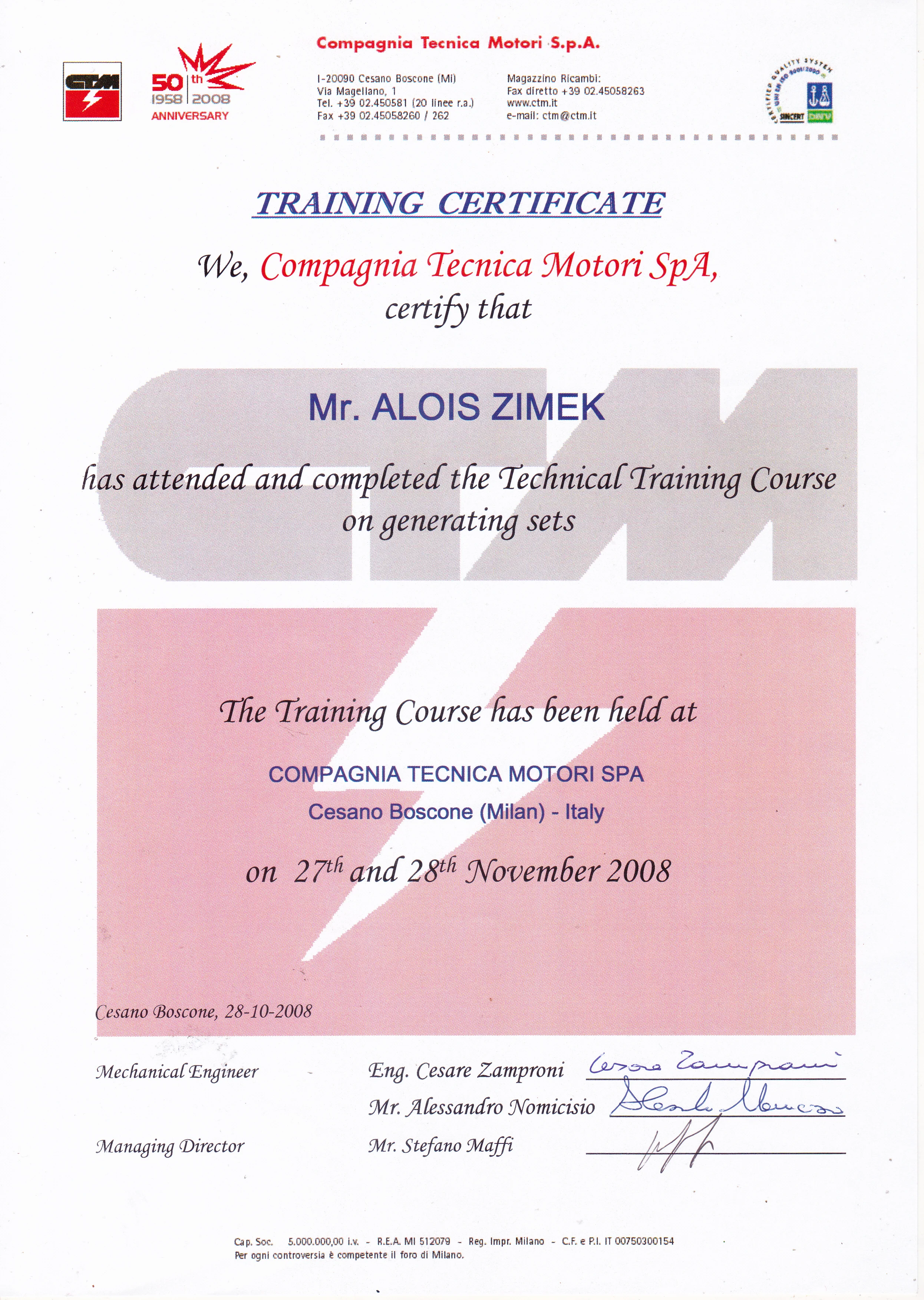 Jsme držiteli několika certifikátů od renomovaných výrobců motorů (Volvo Penta, Caterpillar, Perkins, John Deere, Deutz, IVECO - PFT a další), výrobců UPS (Riello, SCHRACK, Socomec, GE, Newave, ABB, APC, VERTIV Liebert a další). Jsme držiteli osvědčení OZO pro protipožární bezpečnostní zařízení (PBZ).